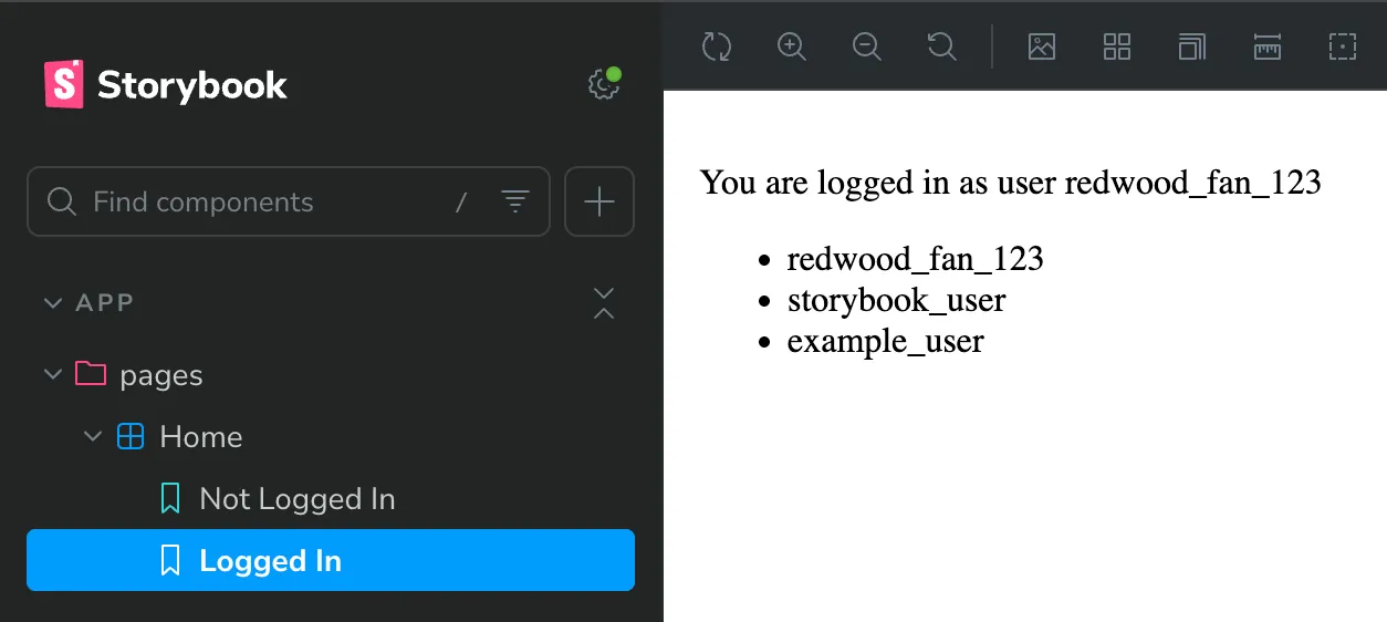 src/app/pages/Home.stories.tsx import type { Meta, StoryObj } from "@storybook/react";// Must include the `.mock` portion of filename to specify that that's what we want to importimport { setupDb } from "@/db.mock";import { Home } from "./Home";const meta: Meta<typeof Home> = {// https://storybook.js.org/docs/writing-tests/component-testing#beforeeachbeforeEach: async () => {setupDb({user: {findMany: () => [{ id: "1", username: "redwood_fan_123", createdAt: new Date() },{ id: "2", username: "storybook_user", createdAt: new Date() },{ id: "3", username: "example_user", createdAt: new Date() },],},});},component: Home,};44 collapsed linesexport default meta;type Story = StoryObj<typeof Home>;export const NotLoggedIn: Story = {args: {ctx: {user: null,session: null,},},};export const LoggedIn: Story = {args: {ctx: {user: {id: "1",username: "redwood_fan_123",createdAt: new Date(),},session: null,},},argTypes: {ctx: {options: ["redwood_fan_123", "storybook_user", "example_user"],mapping: {redwood_fan_123: {user: { id: "1", username: "redwood_fan_123", createdAt: new Date() },session: null,},storybook_user: {user: { id: "2", username: "storybook_user", createdAt: new Date() },session: null,},example_user: {user: { id: "3", username: "example_user", createdAt: new Date() },session: null,},},},},}; -